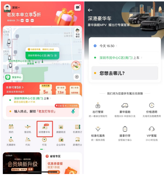 曹操出行新增的耀出行服务中,特别包含深港跨境出行选项。该服务选用配备两地车牌的高端车型,提供从深圳湾直达香港核心区域的通行服务。乘客可享受全程无换乘、行李无需转运的便捷体验,配合高效通关安排,真正实现“门到门”无感通行,为频繁往来双城的商务人士及高端旅客提供了极大便利。